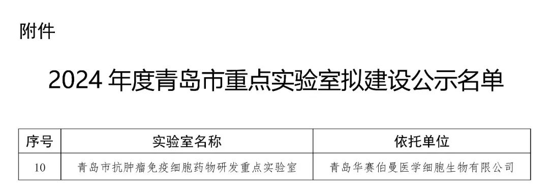 近日,青岛市科技局发布“2024年度青岛市重点实验室拟建设公示名单”,华赛伯曼申报的“青岛市抗肿瘤免疫细胞药物研发重点实验室”位列其中!