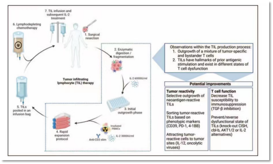 2023年3月,荷兰癌症研究所和莱顿大学医学中心联合发表了一篇题为Novel strategies to improve efficacy of treatment with tumor-infiltrating lymphocytes (TILs) for patients with solid cancers的综述,剖析了当前TIL的生产过程,并对可以提高TIL疗效的改进措施进行了概述。