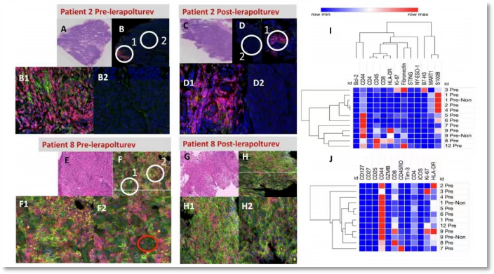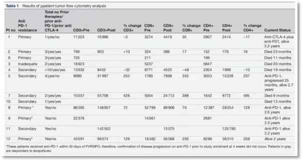 Lerapolturev是一种脊髓灰质炎病毒减毒活疫苗。之前的研究指出,Lerapolturev可以促进肿瘤细胞的裂解,激活TME中抗原提呈细胞(APC),触发炎症反应,从而使黑色素瘤患者对抗PD-1治疗敏感。在这项临床研究中,作者评估的是12位晚期不可手术的黑色素瘤患者在使用Lerapolturev前后肿瘤组织内和外周血液中相关生物标志物的变化。