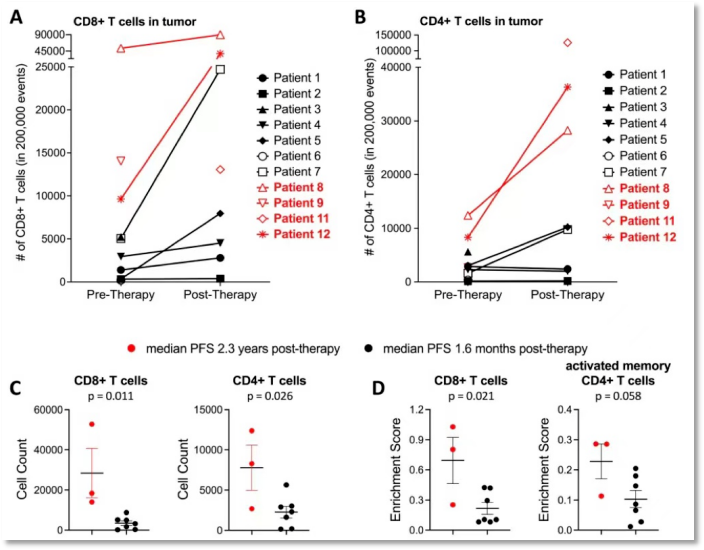 使用Lerapolturev之前,3名无反应的患者CD8+T细胞密度减少,剩余4名患者CD8+T细胞密度增加;而他们的CD4+T细胞密度均增加。