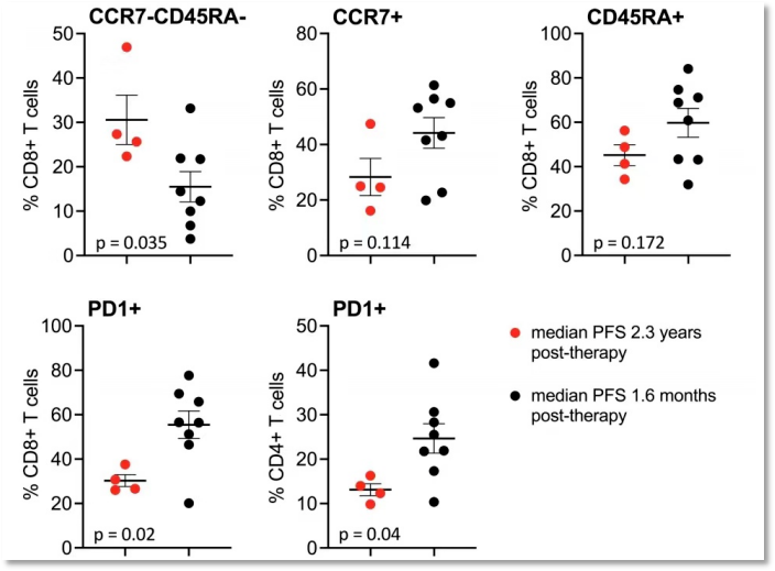 外周血分析的结果显示:有4名患者(包括3名在使用lerapolturev前30天内接受抗PD-1治疗的患者,他们的肿瘤组织在预处理前CD8+T细胞浸润程度更高)的效应记忆细胞(CD8+、CCR7-、CD45RA-)显著增高,抗病毒反应更强,但CD8+PD-1+和CD4+PD-1+降低,中位PFS为2.3年;相比较之下,其他8名患者的中位PFS为1.6个月(图3)。
