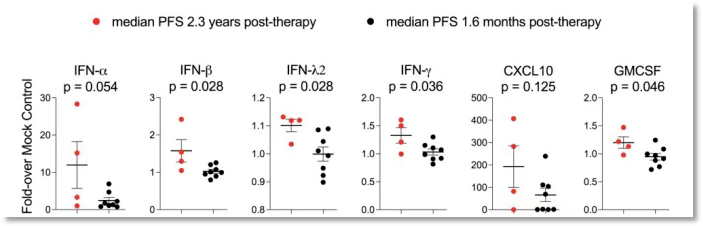 另外,使用Lerapolturev 24h后,患者外周血的细胞因子增加了1倍。与中位PFS为1.6个月的患者相比,中位PFS为2.3年的患者外周血中的IFN-β、IFN-λ2、IFN-γ的水平显著提高(图4)。