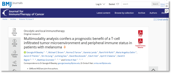 Beasley GM, Brown MC, Farrow NE, Landa K, Al-Rohil RN, Selim MA, Therien AD, Jung SH, Gao J, Boczkowski D, Holl EK, Salama AKS, Bigner DD, Gromeier M, Nair SK. Multimodality analysis confers a prognostic benefit of a T-cell infiltrated tumor microenvironment and peripheral immune status in patients with melanoma. J Immunother Cancer. 2022 Sep;10(9):e005052.