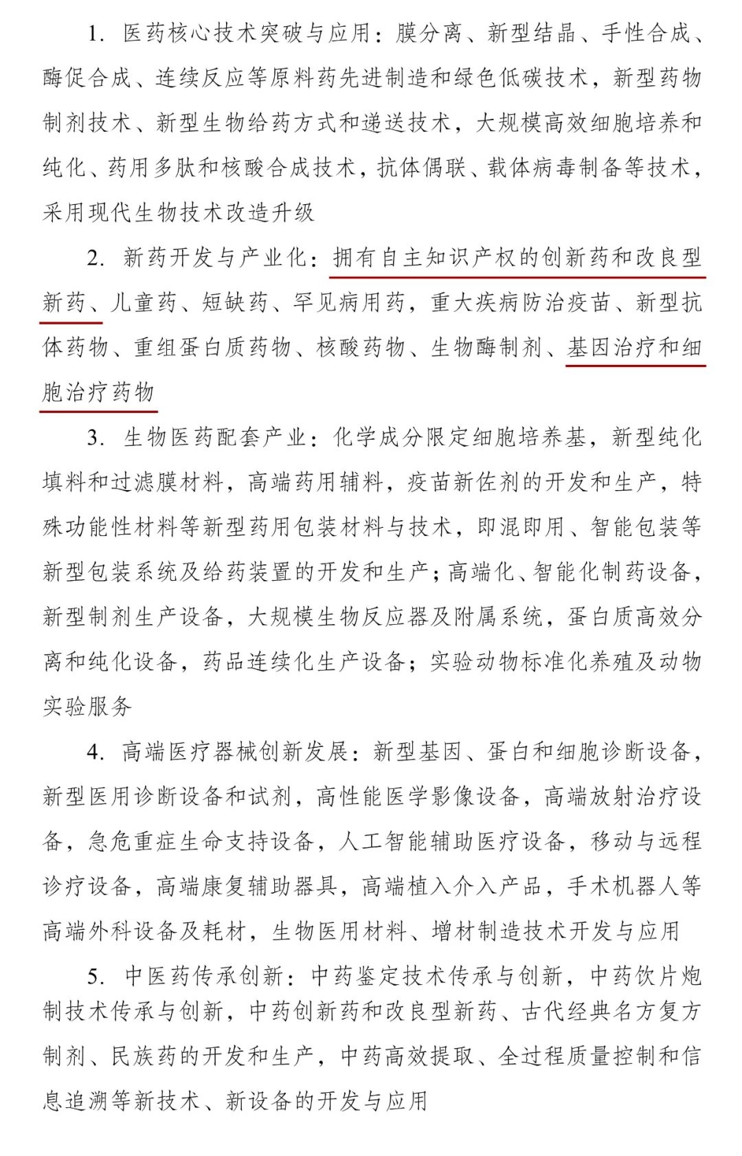 “医药”大项下包含“医药核心技术突破与应用”、“新药开发与产业化”、“生物医药配套产业”、“高端医疗器械创新发展”和“中医药传承创新”五部分内容。“大规模细胞高效培养”和“化学成分限定细胞培养基”等基因和细胞治疗药物开发相关领域也被列为鼓励发展的产业方向。