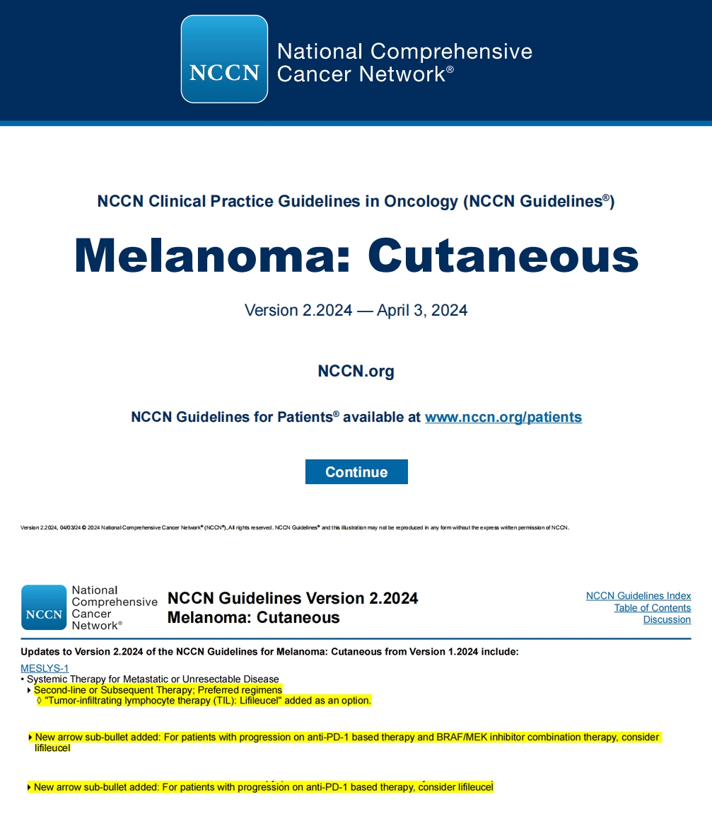 2024年4月3日,美国全国癌症综合网络(NCCN)对皮肤黑色素瘤进行了第二版更新(Version 2.2024),纳入美国IOVANCE公司开发的肿瘤浸润淋巴细胞(TIL)产品AMTAGVI(lifileucel)。AMTAGVI的“火速”入选距FDA批准上市仅不足50天,基于先前IOVANCE发表的C-144-01关键临床数据,末线治疗患者ORR为31.4%,12个月以上的DOR率为43.5%。