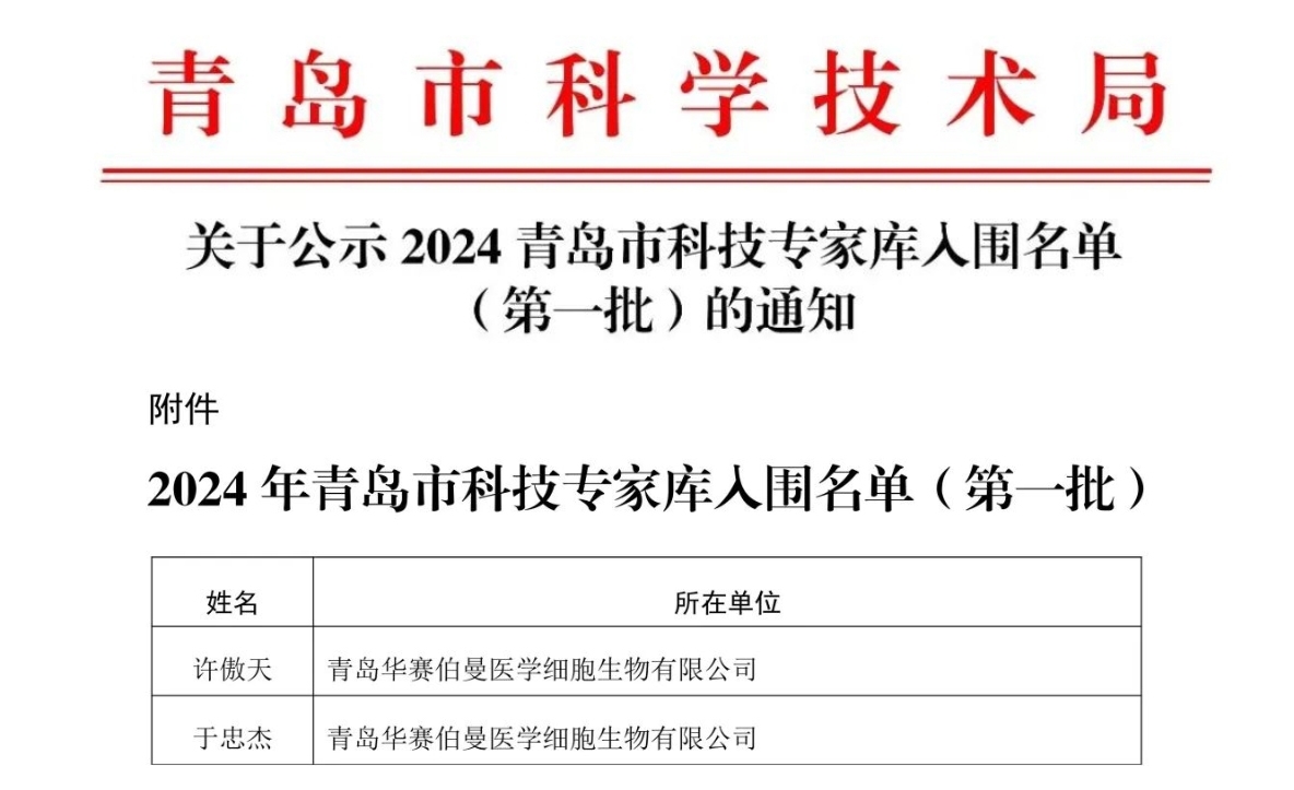 近日,青岛市科技局发布《2024青岛市科技专家库入围名单(第一批)》,华赛伯曼高级研发总监许傲天博士、研发部副主任于忠杰博士成功入选并入库科技研发类专家。